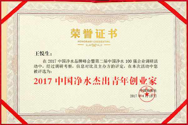 4月18日,2017中國凈水品牌峰會暨第二屆中國凈水100強企業(yè)頒獎盛典在北京維景國際大酒店圓滿落幕。榮事達水工業(yè)公司總經(jīng)理王悅生榮獲“2017年中國凈水杰出青年創(chuàng)業(yè)家”稱號。