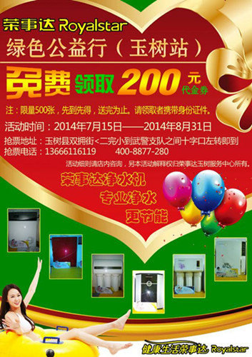 •     為實現“讓中國人喝上安全水”的夢想,榮事達水工業公司將在全國開展 “綠色公益行”活動,通過一系列為民、惠民的宣傳和服務,關注居民飲水健康,倡導綠色生活。