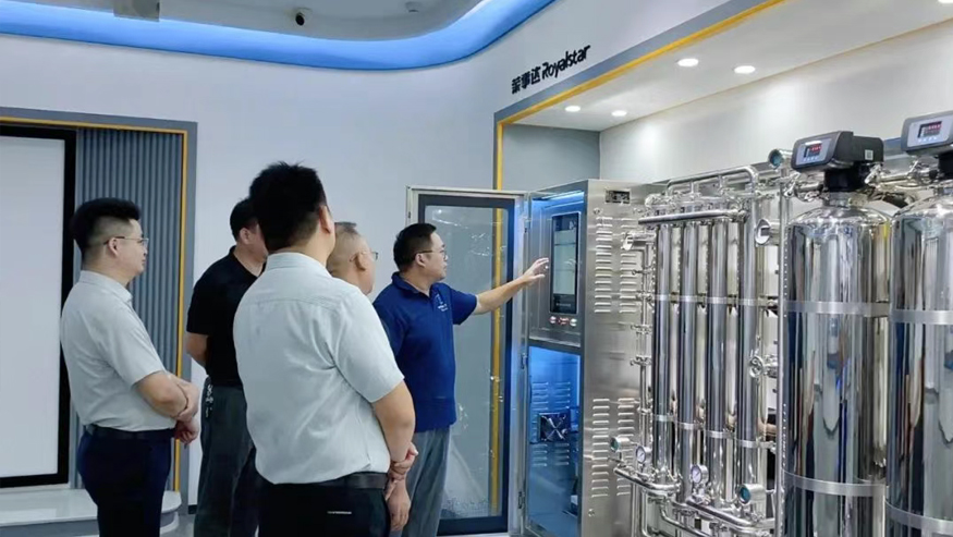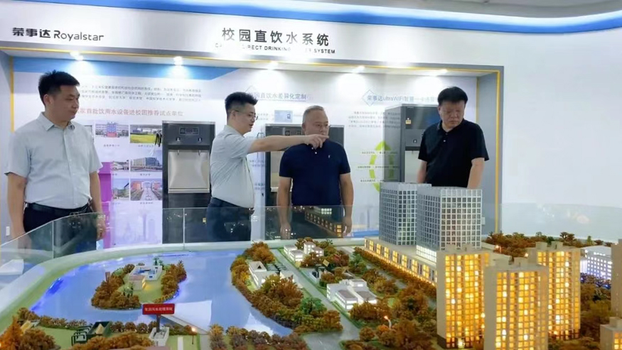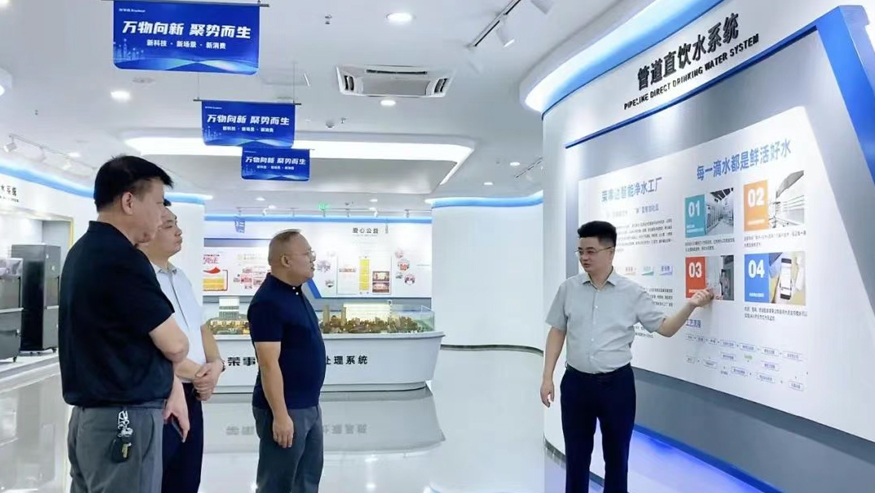 白冰董事長一行認真聽取講解,還就榮事達管道直飲水項目的設備性能、技術原理等細節與陪同人員深入交流。榮事達管道直飲水項目是針對社區、學校、醫院、企事業單位及工廠等場景,提供定制化飲水模式,涵蓋社區智慧水站、校園智慧凈水屋、高端直飲水設備及變頻供回水系統,旨在為民眾打造便捷、高端、健康的飲水服務。