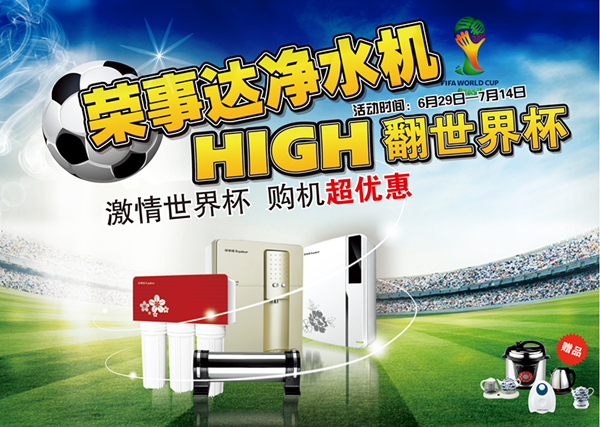 全世界共襄的足球大戲已經(jīng)拉開戰(zhàn)幕,四年一度的王者之戰(zhàn)正趨于激烈。為回饋廣大消費(fèi)者對榮事達(dá)凈水機(jī)一貫的支持與厚愛,值巴西世界杯之際,榮事達(dá)凈水機(jī)將于2014年6月29日至7月14日面向全國開展“High翻世界杯”活動。活動期間,榮事達(dá)凈水機(jī)將在各地開展一系列世界杯主題讓利活動,為在南美鏖戰(zhàn)的足球英雄們搖旗吶喊!